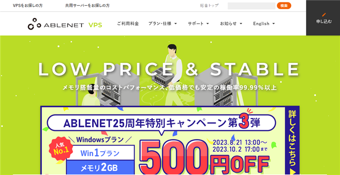 ABLENET VPSは、日本国内で運営されているVPS(仮想専用サーバー)サービスです。